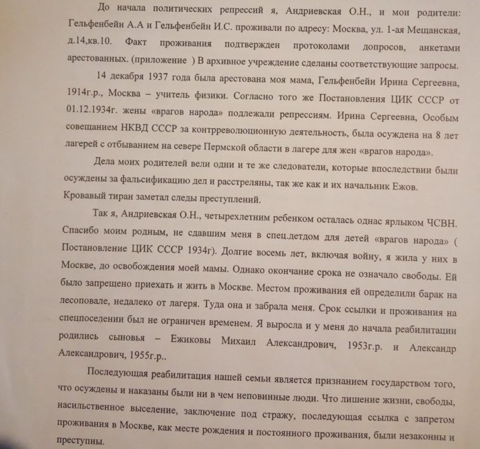 "Я помню, когда в последний раз [перед арестом] видела маму. У меня были длинные волосы, она сидела и чесала их, я ее просила взять меня с собой на Лубянку, она сказала: "Нет", – ушла и не вернулась. Ее взяли как жену врага народа", – рассказывает Андриевская.